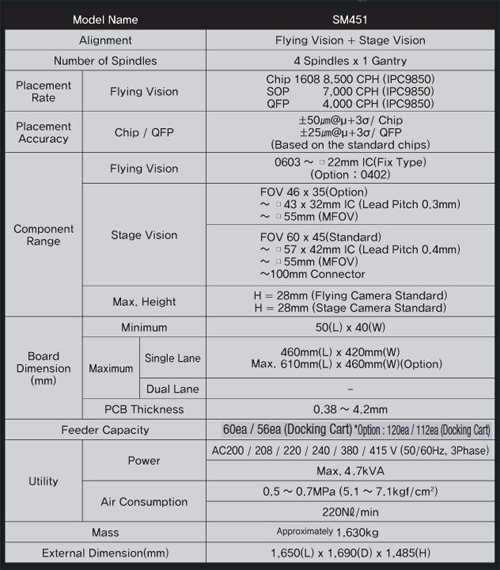 The SM451 is a high-precision multi-functional chip shooter equipped with a high-precision force control head based on the SM421 platform. It applies a linear scale to the X-Y axis to improve placement accuracy. Basically, it can be applied to various odd-shaped parts from 0402(01005) fine chips to 57 x 42 mm IC parts, long connectors, bare chips, and PIP insert parts. In addition, it also allows placement of special parts by providing gripper nozzles and supports the functions for part height adjustment of up to 28 mm, applicability to POP, leads lift-off check, and rear side reflection recognition.